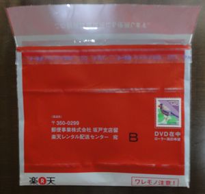 今朝も快晴ですね。寝苦しい夜が続きます。どうせ夜、眠れないので、映画でも観ようかなあ。と思って、楽天レンタルしてみました。¥99/枚 と安いのでびっくり。どのように送られてくるのかと思ったら、DVDの大きさとほぼ同じで、あっさりしていてびっくり。ワレモノ注意がなければ、普通の郵便と全く同じですね。返却も、これをそのまま送り返せばいいんだそうです。簡単すぎて、怖い。そう言えば、送料¥300/6枚になっていたのですが、片道¥140なんですね。ほぼ、実費ということのようです。なるほど。暑くて、外に出たくないときにはお勧めですね。