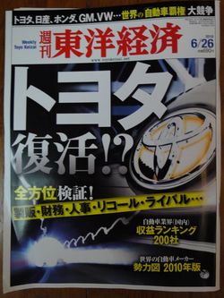 今日もいい天気でした。梅雨の間の晴れは、素晴らしい。得した気分になります。少し前になりますが、題名にくぎ付けになり買った雑誌がありました。これです。実に、色々な角度から記載されています。当然、リコールの影響を脱したのかどうか・・・。と思いながら買ったのですが、その後にレクサスのリコールがあったので、残念でした。読んでみると、世界で700万台が損益分岐点となっているようなので、アメリカで行われているインセンティブも、そう簡単には無くならないですよね。記事には、全世界の工場で、どの車種が生産されているかも分かりやすく記載されているので、つい最近、中国のストライキで影響を受けた車種や、インドの影響車種も目にできて素晴らしい。いろんなところで、いろんな車両を生産しているんですよね。そうそう、こんな記事もありました。系列内競争でコスト半減だとか。以前、働いていた工場で、「開発してこんなに小さくできました。」「で、いくらで売れるんだ。」「小さくなったので、30%減です。」「開発費を掛けて、売上落として、何を開発したんだ。」と怒られたことがあります。笑い話ですね。こんな会話しているから、利益が出ていない会社なのかも知れません。この雑誌、よく取材されていて、読んでいて面白いですよ。お勧めです。週刊 東洋経済 2010年 6/26号 [雑誌]価格:690円(税込、送料別)最新版は、こちらですね。まだ、読んでいません。週刊 東洋経済 2010年 7/3号 [雑誌]価格:720円(税込、送料別)