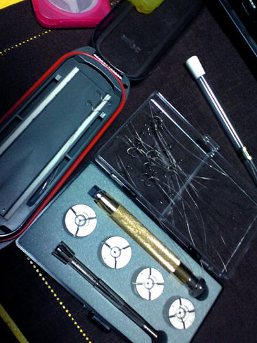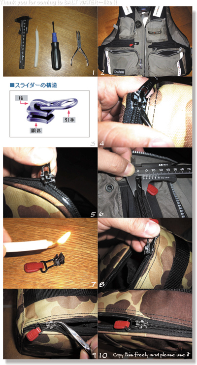 今日のBGM Sly And The Family Stone - Stand昨日は、妻良でJC磯の東海予選の予定だったけど、凪が悪くて延期になってしまった。そういえば、妻良の沖磯もしばらく行ってない。ただでさえご無沙汰だったのに、去年、船長が変わってしまったので、更に足が遠のいてしまった。前、お世話になっていた妻良の船長はオンライントレーダーで、磯上がりの後よく株の話をした。「ボケ防止になると思って渡船の合間にちょっとだけやってる程度ですよ」なんて言っていたけど、触っている銘柄を聞くと、殆どが、当時激しく乱高下していた新興市場のIT関連や、仕手性の強い株ばかりで、穏やかな船長のイメージとあまりにもギャップが大きくて驚いたことがあった。あれから、ライブドアショックがあったり、100年に1度の金融危機が今も続行中なのだが、無事乗り切ることができたのだろうか。もし、今もトレードしてるとしたら、きっと新興不動産、その他金融あたりを監視しているに違いない、などと勝手に想像した。妻良が久しぶりというか、だいたい、磯の上物をやったのが、先月のJC関東で半年ぶりだ。以前は年に100日前後は何らかの竿を出していたのだけど、最近は、春のトーナメントの時期に数回上物の試合に出て、夏~秋に軽くイシダイをやって、その合間にエギやサーフ、ちょい投げやフライをちょこちょこ挟むみたいな釣り生活になりつつある。そんなたまにしか釣りをしない人を『Occasionally Angler』通称『O.A.』と最近勝手に名づけた。私のような『O.A.』や多魚種釣り師の大敵と言えば『ファスナー』だ。釣りの道具やウエアーはやたらとファスナーが付いていて、1年も放っておくと、塩噛みで固着して微動だにしないことになっている。釣りを組み立てる前に、まず、ファスナーの塩噛みを分解しなくてはならないのだ。1年前のJCに出た時にも、このネタを書いて、その時は 塩噛み成分を分解するスプレーを紹介した。しかし、ファスナーの固着は、スライダーという、引き手の金具の腐食によって起こるものなので、ケミカルで錆びを取り除いても、結局スライダー自体がもろくなっていて、壊れてしまうことも多い。Webで色々調べてみたのだが、ファスナーの修理をしてくれるショップは結構あって、街の洋服リフォーム屋などでも、やってくれるらしい。だいたいどの店でも、1箇所あたり1000円位と、手作業の割には比較的安価で出来るようだ。しかし、考えてみると、それだけ安い値段で出来るのならば、意外と簡単な作業なのでは?と疑いも湧いてきた。そんな訳で、この1年、自分でファスナーの修理を何度か試してみて、大体解ってきたので軽く紹介する。 1→必要なもの。ノギス・蝋燭・マイナスドライバー(大中小あると良い)・先曲がりプライヤーかラジオペンチ。2→スライダーはファスナーの完成品を手芸屋などで購入できるが、今回は着なくなったライフジャケットのものを移植することにした。エレメント(レール部分)をハサミで切れば簡単にスライダーは外せる。コアなソルトアングラーならば、ファスナーが付いているものを捨てる前に、スライダーを取ってキープしておくのも手だ。3→作業を簡単に言うと、スライダーの画像右側の部分を広げて→外して→はめて→閉じるというだけのことだ。メーカー広報では0.1mm単位の精度の高い技術がいるとあったが、不器用な私でも今まで数回修理し、不具合は一度もない。4→固着したスライダーをマイナスドライバーでこじ開けるエレメントに刃先が当たってしまうと、コマが削れたり取れたりしてしまうので角度に気をつける少しずつ大きなドライバーに変えながら3mm程こじ開ければ、外すことが出来る5→片方づつずらしながら、スライダーを外す。この後、エレメントにこびりついている白錆を 塩噛みスプレーや、ワイヤーブラシなどで落としておくとよい6→移植するスライダーのサイズを測るエレメントを閉じた状態の横幅が規格寸法で、そのサイズが合えば大体はまる。種類も、規格サイズも数種類しかないので、それ程シビアになることはないと思う。ちなみに、これは樹脂ファスナー、コイルエレメントの65EY。参考 YKKのHPスライダーはメッキのタイプより、塗装のタイプのほうが腐食に強く堅牢だそうだ。7→スライダーの内側にロウを垂らす粘度の高いオイルでも良いが、後々の腐食予防を考えると、ロウが堅いと思う。この作業は、スライダーを仮付けする時、レールのピッチを合わせる作業にも関係してくるので意外と重要だ。8→移植するスライダーの方も、3mmほどマイナスドライバーでこじ開ける。こじ開けた方から斜めに差し込むようにスライダーをエレメントにはめていく。この時点ではエレメント左右に生じるズレは気にしなくてもよい。9→両側がはまったら、プライヤーで広げたスライダーを軽く潰す。仮潰しの状態で、一旦エンドまでスライダーを閉じる方向に持っていき、ずれている左右のエレメントのピッチを合わ