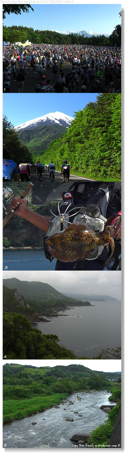 今日のBGM Ray Charles - Hit the road Jack先週は、毎年恒例になりつつあるmt.富士ヒルクライムに出て、その後伊豆半島まで足を伸ばした。富士吉田から富士山の裾野を回り込んで御殿場に抜けるルートは、相変わらず壮大な景色で気分が良い。明けて月曜日、朝からウェーディングして、アオリイカとヒラスズキの2本使いでランガンをかけた。『六月をきれいな風が吹くことよ』という正岡子規の俳句があるが、6月の伊豆半島の海は汚い。そして臭い。どこも赤潮が酷い状態だ。そのせいなのか私が下手っぴなのかは解らないけど、釣果といえば、妻良で出た小さいアオリイカ1杯だけだった。海がそんな感じだったので火曜日はサイクリング。宿のある伊豆高原から一碧湖、修善寺の方に抜けて天城を上り河津に降りて北上するルートを選んだ。道中の狩野川や河津川には、沢山の鮎釣り師が入っていた。レース後で足が痛かったのというのもあって、橋がある度に止まって橋の真ん中から人の釣りを見学。中瀬周りはかなり混雑していたけど、皆、気持ちが良い位コンスタントに鮎を掛けている。そんな中、なんでこんな所を?といったような非常に難しい場所を攻めている人がいた。私はどっちかというと、こういう人の釣りに惹かれる。釣りの楽しさとは、決して魚を捕るということがゴールではないのだ。人の釣りを見るのは本当に面白いし、見てるとやりたくなってくる。その後、海沿いの道を走りながら色々考えた結果、今年から本格的に鮎釣りを始めることに決めた。まぁ、イニシャルコストはかなりのものになるけど、それでまた、仕事にもトレードにも身が入るというものだ。今年1年で、何とか人並みに掛けられるくらいのレベルになりたいと思っている。1→mt.富士ヒルクライムの会場。今年は過去最大5000人のエントリーだったらしい。2→レースは去年のタイムより15分縮まった。まぁ去年は足が故障してたので、大した進歩はなかったと思う。3→妻良で釣れたイカ、全く抵抗しないので見えるまでゴミかと思った。4→菖蒲沢の磯、海岸線に沿って赤潮が出ている。5→狩野川。