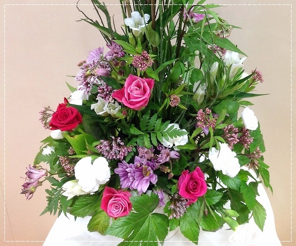 Natural Classical基本形 両面構成 コウン(円錐)スタイルのアレンジメントはおそらく3日後にはサヨナラしちゃう(枯れる)であろうバラ、ホトトギスと おそらく3日後ぐらいから満開になるであろうリンドウと水揚げが難しいフジバカマゆえ 思わずみんな頑張れ~“o(><)o”くう~!枯れるな、開け~ウミュゥゥ!! o(≧~≦)oと話しかけましたので(製作者)ベラベラベラベラ…(/  ̄▽)/