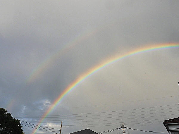 台風が近づいてきたと言えども仕事は待ったなしでチンタラテキパキこなしつつ、ふと外が急に明るくなったことに気づき「ああ、台風が去って青空が出てきたんだな~」と思っていた矢先ザザーっと強めの通り雨が降りん?通り雨?ってことは?もしかして?と外に出てみれば虹が現れているではないですか! それも今日の虹はとても鮮やかで吸い込まれそうな色彩ですが、気がつくのが遅かったため虹は消え始めているのが見て取れ 何でもっと早く気がつかなかったんだ!ボケ!カス!と自分を責めつつ←ヾノ´゚д゚`)ナイナイカメラを構えると7月7日の虹よりは北側で 7月8日の虹よりは綺麗な半円を描いているはずなのに 流れる雲とともに消え行く虹の全景を撮るまでには至らず せめてもと、色彩だけをズームしてみたのでしたがなーんかピントが合ってないような・・・私らしい写真になったのでございます だって慌しかったんだもん(ボソッ)←言い訳がましい管理人 (*≧m≦*)プププw