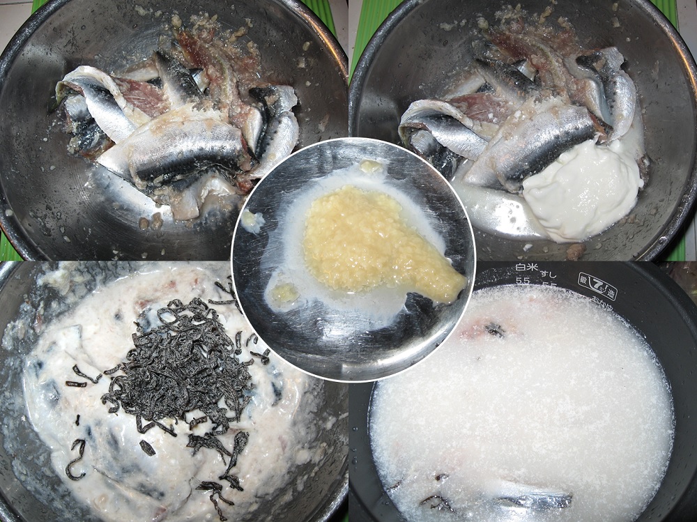 ご飯を洗う間なので 5分程度浸けた鰯を つけ汁ごと お釜に入れて