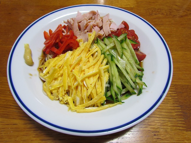 今日は、暑いので今年初めての「冷やし中華風そうめん」を作ってもらいました。たれはもちろん自家製です。夏の定番メニューです。まだ夏ではありませんが・・・