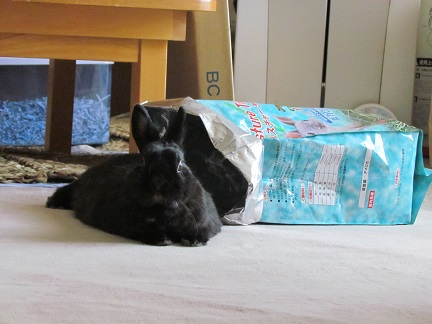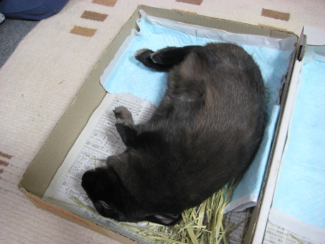 家に来たころは1.6キロあり、獣医さんからはもう少し体重を減らしてください。と言われました。今、クロミンは体重は1.4キロで落ち着いています。ネザーランドドワーフと何かの掛け合わせだとの事です。ウサギが横になって寝る時は、勢いをつけてひっくり返ります。写真は、箱の中でリラックスしている姿です。この場所にオシッコをするので箱を置いてチモシーと給水シート安全の為、新聞紙を敷いてあります。箱を齧って人を呼びます。特に眠い時!箱は齧られ縁が無くなってしまいます。