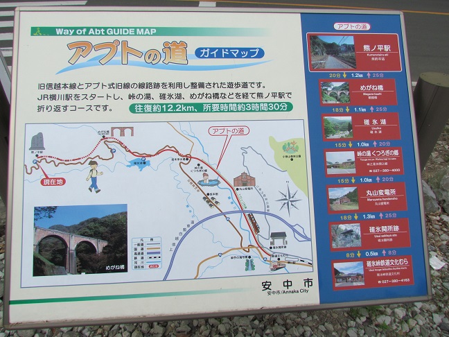 碓氷峠の旧道にある熊ノ平駐車場に車を止めて、アプトの道を少し歩きました。めがね橋の駐車場はあまり大きくないので、此方に止めたほうが良いように思えます。めがね橋まで1時間ぐらいで往復出来ます。トンネルの中はヒンヤリしています。旧熊ノ平駅は心霊スポットとして知られています。1950年6月8日に土砂崩壊が発生、6月9日に再度土砂崩壊が有り、駅舎・鉄道官舎が埋没し約50名の方が犠牲になったようです。1918年3月7日貨物列車が緊急停止後、再発車しようとしたが起動せず急勾配を後退して、熊ノ平駅の引込線に突っ込みトンネル出口壁に激突して4名が犠牲になる事故が有った。