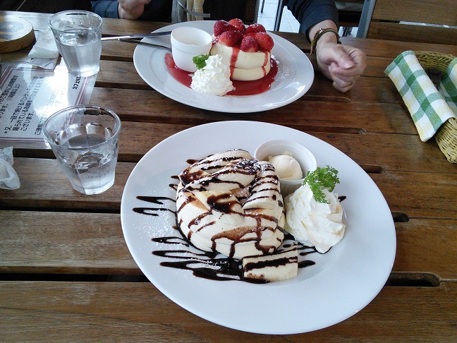 桶川市にある「カフェN36°」に行ってきました。パンケーキが美味しいと聞いていたので、ティータイムに行きました。ドッグランが有り沢山の犬が連れてきていました。一人で多数頭連れてきていました。パンケーキ自体はあまり甘くなくて、メイプルシロップかけ放題で美味しかったです。写真は、評判の高い「イチゴ」と「バナナとチョコレート」です。やはり、イチゴに一票!