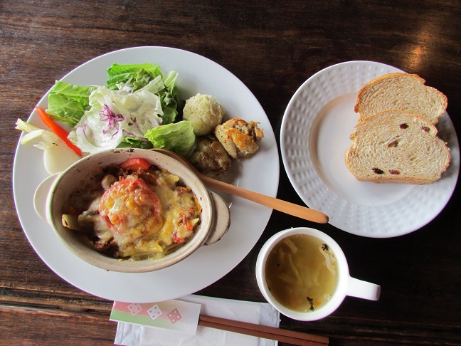 行田市にある、「Cafe 閑居」のランチを食べに行きました。途中で予約の電話を入れて12:20時間どおりに着きました。駐車場はほぼ一杯でしたが、何とか止れました。一時間前に予約を入れたのに、予約席の札が置いて有りました。行くときは絶対に予約を入れるべきですね。混んでいるので、20分位掛かると言われたので、となりの「足袋蔵パン工房 rye」というパン屋さんに行きました。うち好みのパン屋さんでした。季節のパンプレート ¥1,100(2010年)現在は1350円 季節ごはん膳 ¥1,130(2010年)現在は1380円 閑居前景(客席の南側は庭が有ります)