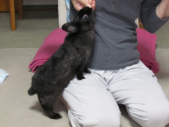 クロミンは抱っこされるのは大嫌いですが、食べ物が欲しい時は自分から寄って来て、おねだりをします。その時は自分から人の上に乗ってきます。時間外のおねだりの時は、チモシーでごまかします。