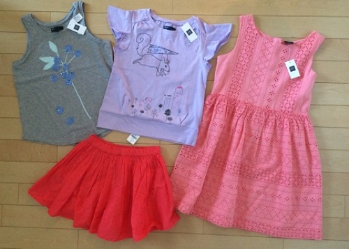 7月の中旬にGAPのセールで購入した戦利品です。6歳の娘に。息子の洋服はこちらを購入する2週間前にオンラインのセールで8点購入したので、今回は娘の物目当てでした。購入したのがこちらの4点まず1点めはカットワークレースが可愛いサーモンピンクのワンピース。若干オレンジがかったきれいな色です。120は売り切れていたので来年も着れるよう130を購入。着ると丈が長めですが普通に問題なく着れました。とてもかわいいですこれ。定価5900円のお品が1891円2点目は朱色っぽいスカート。良く見るとドットのような柄で可愛い1枚。実はこちらのスカートは色違いでエメラルドグリーン色もあったのですが欲しかったサイズの120はセールにはもう残っておらず。130はあったのですが来年用に買っておけばよかったと、少し後悔です。こちらのスカートは定価4900円のお品が1415円3点目は娘の大のお気に入り。ムササビ?リス?が空を飛んでいるかわいいカットソー。袖のふりふり具合も小さい子が着ると可愛いです。色もラベンダーでステキな色です。定価2900円のお品が941円4点目はグレーにブルーのお花が可愛いタンクトップ。お花はスパンコールなのできらきらしてかわいい1枚。これだけ定価をうっかり忘れてしまったのですが確か2900円だったと思います。割引後は940円でした。4点で税込5187円でした。正規のお値段で買うとワンピースのみでも税抜き5900円なのでお得感満載です。GAPはやっぱりセールまで待ってお安く買うのが嬉しいですね。お読みいただきありがとうございました楽天トップへはこちらからどうぞ☆