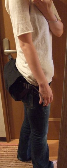 今日はだいぶ涼しかったので、公園にでもゆっくり行こうかと思い久しぶりにバギーポートのヒップバッグの軽装で出かけてきました。お家を出る前に撮った写真です。ホントたいした事無い写真でスミマセヌ。身長163cm体重47kgなんとか7号着用の主婦です。ボトムはD.M.Gドミンゴデニムジーンズフレアーパンツ13-407AのSS。肝心のヒップバッグはこちらです。BAGGY PORT(バギーポート)ウエストバッグ ACR-442 ブラック価格 6,200円 (税込6,510円) 送料込 19日(水)AM9:59までポイント10倍!!!お財布、携帯電話、ハンドタオル、紙おむつ1、携帯用お尻拭き、デジカメが余裕で入ります。ウエストのサイズ調整も結構きくので、旦那さんと兼用で使っています。女性だと、ちょっと長めに設定して肩から斜め掛けもいい感じに出来ますよ。ロゴとか模様の無いシンプルなデザインだし、丈夫な帆布素材のこなれた質感がとても大人っぽくてお気に入りです。今ならポイント10倍の送料無料なので是非チェックしてみて下さいね。ここからは新着です。今年はブーティーなるものが流行ってるみたいですが、コレは足が太く見えないのかしら・・・?COCUEリボンショートブーツ*送料無料*税込9,345円流行り物は1万円以下で。。。 【caliner】秋・冬贅沢福袋! 26,000円 (税込)→ 6,300円(税込)毎回評判の福袋が出てます。ヘンリーネック、キーネック、カーディガン、マフラー、ヘンリーネックニット、花柄シャツの6点が入ってこのお値段! キルティングコート(ロング) 12,800円 (税込 13,440 円) 送料別 jasminspeaksオリジナルのコート。昨年も大人気で完売してましたが、今年も出るのね~9月11日18時00分~の予約販売です。キャメル、ライトベージュ、ネイビー、オレンジ、カーキ、ブラックの6色。このデザインでこの価格はかなり良いわ。 MATURE(マチュア)コットンキャスケット税込 6,930 円 送料込前から気になってる帽子。すっごく形が綺麗で、たぶん可愛く被れると思います。適度に顔を隠しながら・・・これの形も素晴らしく綺麗だけど、高い!!!カシミヤって。。。ホームへ着画アリの商品レビュー日記CI-VA育ててます。