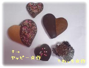 新しい週の始まりです。昨日,おとといの状態では,今日は初の欠勤か?と思いましたが,なんとか無事仕事も終わりました。まだ咳はでるし,咳が出そうになると結構苦しかったりするのですが,声はだいぶ出るようになっているので,子ども達に「ほん よんで!」攻撃を受けても,なんとかこなしてきました。マスクをしていると,小さな子ども達は嫌がるかな?とは思ったものの,全然いつもとかわらず,パワー全開の子ども達です。ここのところ,マスクをする先生が増えているし,見慣れているのかも?学校の方も,久しぶりに長縄とびを回すのを,B君と一緒にやりましたが,私も慣れたせいか,腕が痛くなることもなく,たくましくなったのか・・・?家に帰ってから,お昼を食べて,薬を飲み,小一時間ほど横になりました。その後はほぼいつもと同じ月曜日,でした。***********************************さて,明日は14日。バレンタインデー。と言うことで,この土日,ヤッピー☆はクッキーを焼いたりチョコを作ったり・・・こう言うことは,言われなくてもてきぱきとこなしていました。日曜日は試合で一日出かけたのに,帰って来てから夜もやっていました。わっち☆もヤッピー☆がやっているのを見ていて,やりたくて仕方がなかった,と言うか,食べたくて・・・・?ヤッピー☆がやっている時に手を出すわけにいかないので,じっと見るだけでしたが,日曜日はヤッピー☆がいなかったので,昼間というか夕方,私と一緒に作りました。私も調子が悪くてグッタリと寝たりしていたので,日曜日の夕方にようやくできたという感じ。ヤッピー☆は,クッキーを焼いてチョコでコーティングしたり,凝っていましたが,わっち☆のは,板チョコ2枚を溶かしてアルミのカップに入れるだけのいたってシンプルなもの。湯煎で溶かすところだけ私がやり,あとはわっち☆がスプーンでアルミカップに入れました。最初は,なかなかうまく行かなかったものの,何個かやっているうちにコツがわかったようで,あとはわっち☆に任せました。小さな一口サイズのチョコが,31個できました。子ども達が作ったチョコは,毎年,お父さんとおじちゃん(義兄)にあげています。今年も,写真のように,ヤッピー☆とわっち☆のものをセットにしてあげました。(1日早いけど,今日はおじちゃんもいたので。いつもは夜遅く帰るのでなかなか会わないし。明日会えるかどうかわからないので。)ヤッピー☆とはっち☆は,友達同士で交換するために作っているのですが,はっち☆は「今年はもらった子にあげるから,まだ作らない。でも,みんなが同じ考えだと誰にももらえなくなるかも?」などと言っていました。なんだかなぁ・・・・?Last Update 02/13 素材:ももかんさん
