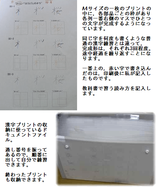 春休みにやった家庭学習について。春休みは,宿題が出ませんから,一番のんびりできる時です。お天気の良い日は,ほとんど,午前中に小学校に行って,鉄棒練習をしていました。鉄棒練習と言っても,鉄棒だけをやるのではなく,登り棒をやったり,ブランコやジャングルジムで遊んだり。その他,家でもタングラムで遊んだりすごろくをやったり,テレビを見たりして過ごすことが多かったですね。ただし,毎日やることとして,「LD児の漢字学習とその支援」からプリントした,5年生で習う漢字を,毎日1~2枚練習することと,4年生の割り算の筆算を3~6題程度やることにしていました。プリント1枚がどれくらいかわからないかと思いますので,ちょっとご紹介します。プリント1枚で一つの漢字を練習するようになっています。だから,毎日一文字か二文字と言う程度。その日の本人の気分次第で,2枚になることもたまには3枚になることもありました。こんな感じのプリントです。↓算数は,以前ご紹介した「トコトン算数ドリル4年生」の割り算の筆算問題をやりました。最低3題(一列分)は,やると言うことで,倍の6題(二列分)になることもありました。割り算の筆算は,手順を思い出せばできるのですが,まだしっかり定着していなかったので,春休みに復習しておかないと,と思ってやらせていました。算数を先にやるか漢字を先にやるか,は,本人に選ばせました。算数をやったらいったん休憩。(遊びやテレビや買い物など)また次の時には漢字をやる時間を自分で決めさせてやらせました。「何時何分から,何時何分までやる?」と,聞いて自分で時間を選ばせました。すると,だいたい自分で決めた時間に始めて,予定より早く終わることもありましたし,なかなか取り掛かれずに時間オーバーすることもありました。が,枚数が少なかったので,その気になりさえすれば,すぐに終わり,「本人もこれだけやった」と言う達成感もあったようです。どれくらい覚えることができたかは,(忘れていないかどうか?)わかりませんが,評価問題はやりませんでした。新学年の国語の教科書をもらって,最初の音読の宿題の時に,すでに練習した漢字が出ているので,スムーズに読むことができました。昨日の算数の授業では,手を上げて答えたようです。(まだ取り出し授業ではなく,TTの先生が入って,みんなと一緒に授業を受けているようです)答えた後に,先生が「早くできたね~!張り切ってるね~!」と褒めてくれた,と嬉しそうに言っていました。5年生になって,本当に張り切っているようです。 壁紙素材:komorebiさん