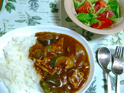 わっち☆の家庭科の宿題は、バランスを考えた食事を一食作ってレポート提出。先日、作りました。夏野菜のカレーとサラダです。レポートには、作った料理の写真を貼ることになっています。で、この↑写真を貼りました。(写真を印刷するために、インクジェット用はがきを使いました。こんなポストカードもいいでしょ?<暑中見舞いに使えそう?)レポート完了です。(材料と感想を書く)材料は、なす・ピーマン・しし唐・かぼちゃ・ズッキーニ・たまねぎ・鶏肉夏野菜はあちこちからいただくので、消費するのが大変です。同じ材料にジャガイモとにんじんを加えて明日はポトフ風にしようかと思案中。(これは宿題とは無関係。材料の消費のためです。)
