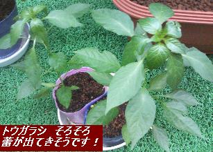 今週はかなり忙しい4日間でした。先日同様、仕事は重なる星の元に生まれたみたいです^^ということで、忙しい中7/5日に写真だけ撮っておいたシシトウです。今年のシシトウは、昨年よりも甘みが強い品種みたいですです。品種が違うからなのか、実のなり方が異なります。昨年は、80%以上の受粉率で、高さ的にはあまり大きくなりませんでした。今年は、受粉率が低いけれども、枝が成長するので蕾みの量は多く、収穫量は昨年と同じ程度です。問題点は、上側が重くなりすぎ、自重で枝が垂れてくることです・・・本日(7/7)、支柱に紐で遠い方の枝は引っ張る形で結びました。■今後の悩み支柱は昨年1mで十分だったのですが、既に高さが超えています。支柱は長くすれば良いのですが、高くなると更に枝が弱くなりそうで本数も倍にしなければならないと考えています。本数を倍にしたとしても、台風来たら耐えられるのだろうか・・・不安です。トウガラシもだいぶ成長してきました。こちらは、収穫量的にはあまりいらないので、過去の写真を見ていただければ解るように十分暖かくなってから蒔きました。やっと蕾が出てきそうです!
