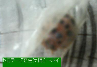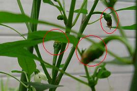 ピーマンの実を、いつのまにか最初に食べていた「てんとう虫だまし」その時のものは駆除していました。本日、シシトウの方にまた出現!今度は、ちゃんと写真を撮りました!なんか手で触るの嫌だし、かといって棒などで落とすと飛んで逃げたり、下の人工芝に入り込んだりして駆除できないので、私はいつもセロテープで「くっつけ」てから捨てています。てんとう虫は、アブラムシを食べてくれる益虫なのに、ダマシときたら・・・