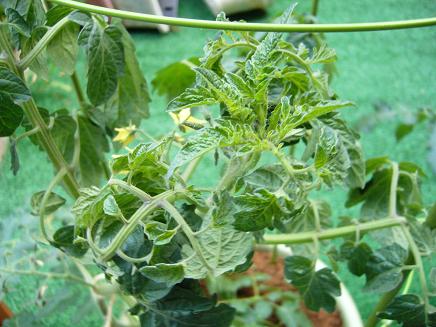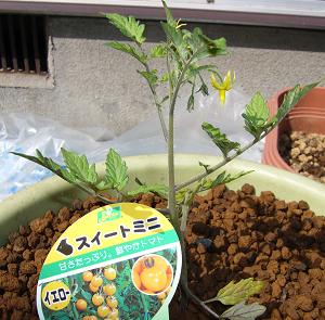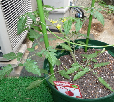 もう、花が咲いています。グルグル支柱に巻こうと思い、芯の先端は変な方向を向いています。うまく巻けるかは疑問ですが・・・トマトの枝は、結構ポキポキ折れるんですよね。