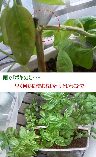 昨日の夜の大雨で折れてしまいました・・・という事で、1/3の葉を収穫し、乾燥バジルを作ることにしました。1)収穫後、葉のみを切り取る2)ザルとボールで優しく水荒い3)水を軽くふき取り、重ならないように皿の上に置いたキッチンペーパーに広げる4)電子レンジに入れ、最強出力に設定する。(うちでは1000W)5)初回の乾燥は、電子レンジ内が水蒸気で覆われたら取り出す。6)別のキッチンペーパーに葉のみをのせ、拭いた皿の上にセットし、また水蒸気が出るまで乾燥させる。7)別のキッチンペーパーに葉のみをのせ、拭いた皿の上にセットし、40秒(1000W)乾燥させる(まだ乾燥しきっていないのでフニャフニャです)。8)残りの葉も同じようにする。9)8)まで済んだ葉をキッチンペーパーに重ならないように並べ、40秒程度の乾燥を4回程繰り返す。10)乾燥し、手で砕けるようになったら、キッチンペーパーを袋状にして潰す。(パリパリと全体が砕けない場合は、乾燥が足りないのでパリパリになるまで乾燥をする)11)粉状の葉をもう一度、電子レンジに入れ乾燥させると完成!市販のものよりも、色鮮やかで香りの良い乾燥バジルになります!注意点!・葉に力を入れすぎて潰さない!・電子レンジにより皿が熱くなるのでヤケドに注意!(キッチンペーパーのみを触り、作業をすると良い)・乾燥させすぎると、焦げた後にアークが飛ぶと思われるので、必ず目視しながら作業を行う。・自己責任でお願いします
