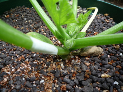 先日、ミニトマトなどを定植したときににズッキーニも植えていました。その直後の強風で葉への茎が折れたので、駄目もとで、怪我などをしたときにガーゼを止めるテープで巻いてみました。(骨折した場合のテーピングをイメージ)枯れずに今もついているなんて、植物も強いですね!ズッキーニに蕾が付き始めています。良く見るとかなり、密集しています。どんな生り方をするのでしょうか。今~楽しみです。
