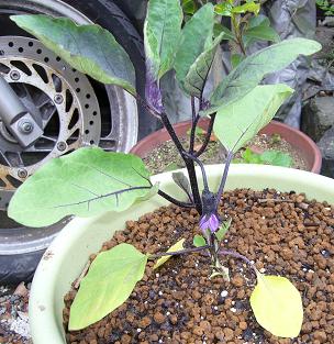 土に肥料を入れて混ぜたりしてクタクタです・・・この土は、昨年育てたナスの土です。通常は連作障害が出るので同じ土で栽培しません。しかし、今回初めて接木苗を買ってみました!接木苗というのは、根っこの部分がナス科じゃないんです!病気にもなりづらく元気に育つとか!価格は普通の苗の3倍しますが土を新たに購入することを思えば安いんじゃないでしょうか。この苗は、ミニトマト、ゴーヤと一緒に先週買ってきてポットのまま水をやっていたものです。1番花が咲きかけています!1週間で、まさに定植にもってこいのタイミングになりました!ナス定植 5月5日