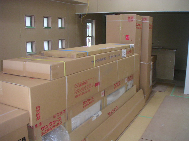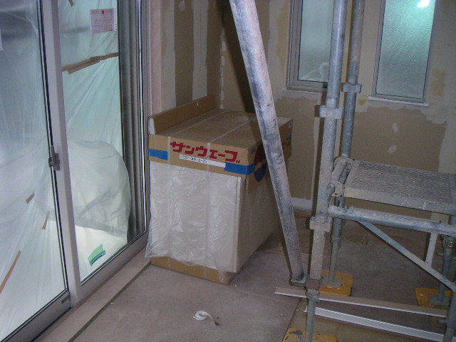 いつまでしぶっとんねん!って怒られそうなんで。そろそろいきますか!習字用のシンクです。なに?こんなんどーでもいい?いきますいきます。こんだけじらしたけど普通やでぇ~まずは後ろのカップボードとキャビネット結構大きかったんで実物みてビックリしました。そら高いはずやでぇそしてキッチンです。幅は270cmにしてもらいました。どっちも養生のシートが被っていて見にくいですが完成後にまた撮りますんでお許しを!話は変わりましてリビングにまた足場が組まれてました。クロスが張り終えるまでこの状態です。残念。えっらい雨なんで黒に戻しました。