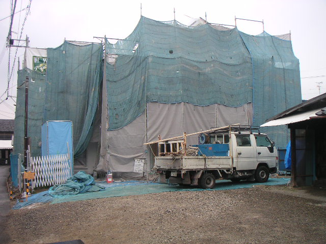 吹き付けが始まりました。現場に行ってみたところ、トルエンの香りはしませんでした。←何でやねん!今は環境の問題とかで水性塗料を使用するのだそうです。(当たり前?)屋根まで全部がシートでマスキングされていました。薄く白く吹き付けてあるのは下地だそうでこの上から本チャンです。真っ白に吹き付けされています。白すぎ?そうこうしてたら、雨です朝の太陽は何処いってしまった?作業続いてるけどいいんか?軽く心配です。黒やしアカンのかなァ~明るい色に変えるんで晴れるようにクリックお願いします。