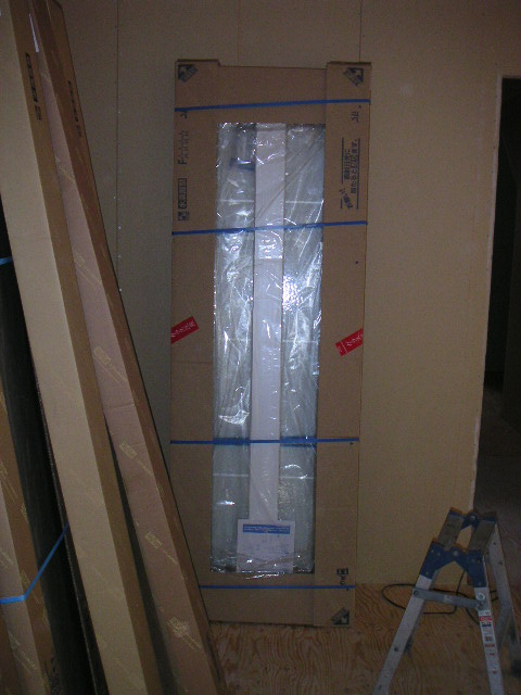 建具が来てました。廊下のドアです。プライベートスペースとパブリックスペースを分ける為に廊下にドアを付けました。右が寝室で後の部屋は左のドアにしたと思います。早く付けて欲しい!報告です。書斎カウンターの寸法は幅362cm、奥行き45cmでした。