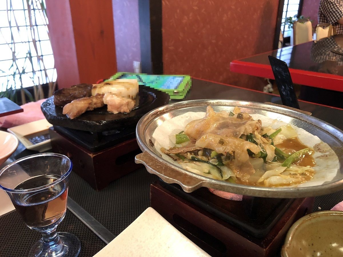 こちらの旅館、陶板にのった肉、その他、を仲居さんが焼いてくださる。。