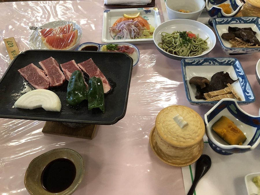 夕食です。食事は食堂でいただくのですが、お安い料金にもかかわらず、馬刺しがついていたのには驚きました。もっとも私は苦手なので夫さんに進呈いたしましたが。これに加えて山女の塩焼きがついていたのですが、写真を撮り忘れているようです。