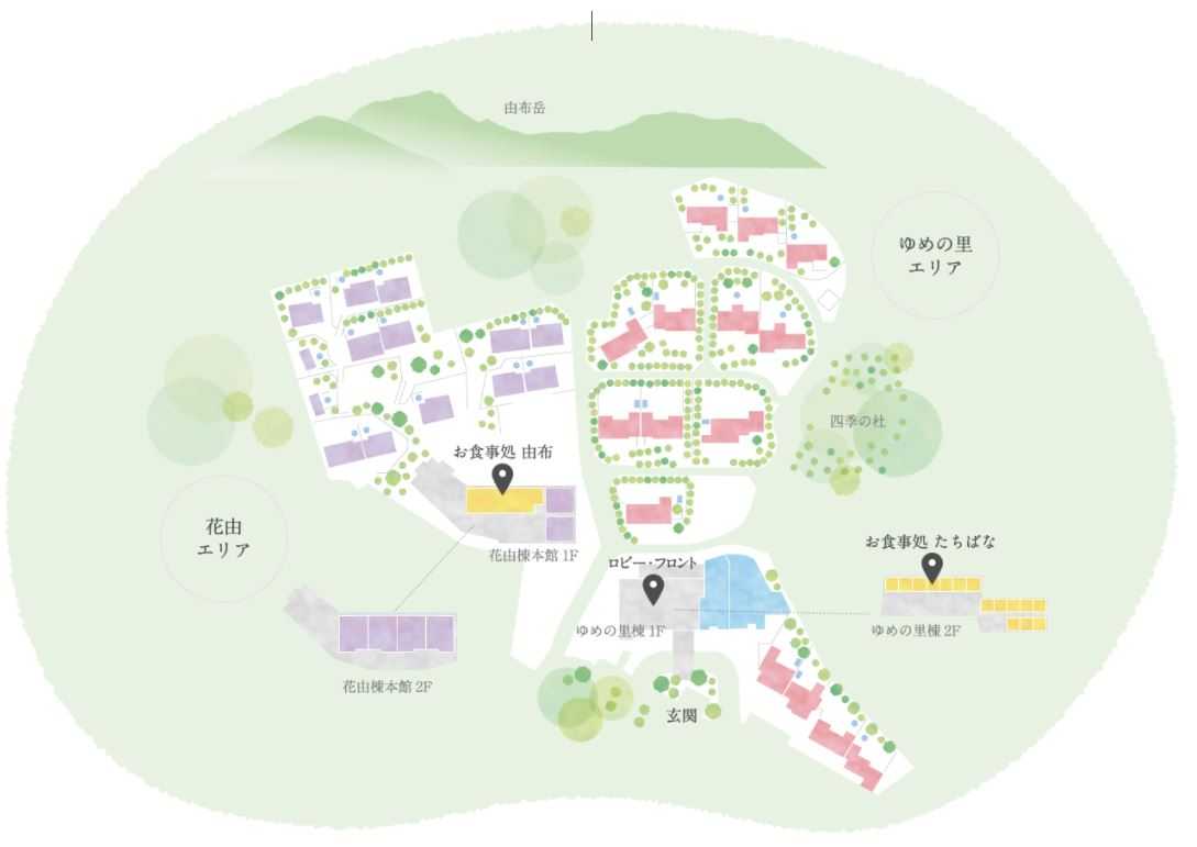 こちらのお宿は、公式サイトからお借りした図で説明すると2つのエリアに分かれていて、それぞれ花由エリア、ゆめの里エリアというようです。今回は花由エリアに宿泊。