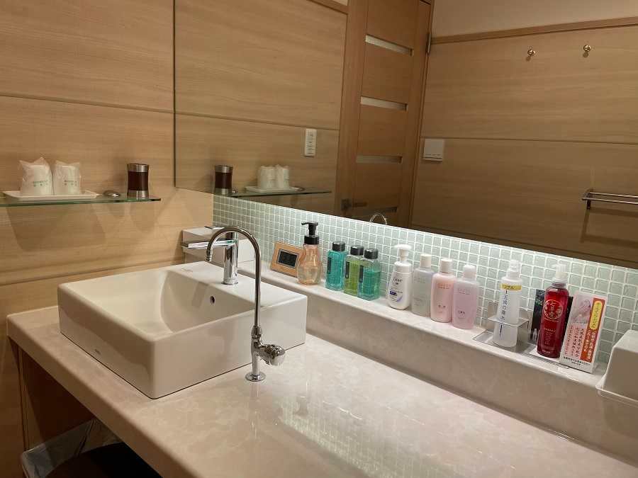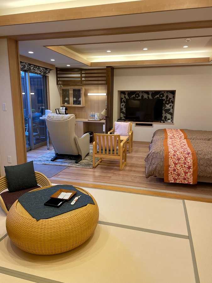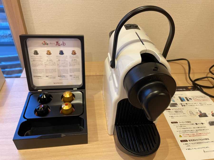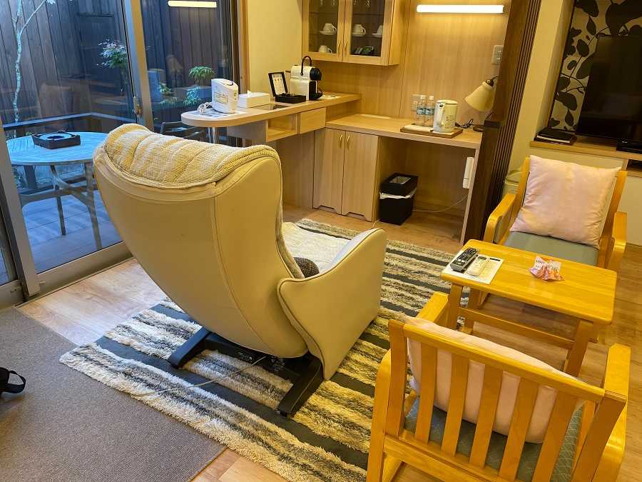 お部屋に向かって降りていきます。お部屋にマッサージチェアや美顔器まであるところが珍しいところです。コーヒーはデカフェも用意されていましたし、至れり尽くせり・・・。美顔器はパナソニックのスチーマーナノケアだったかな。