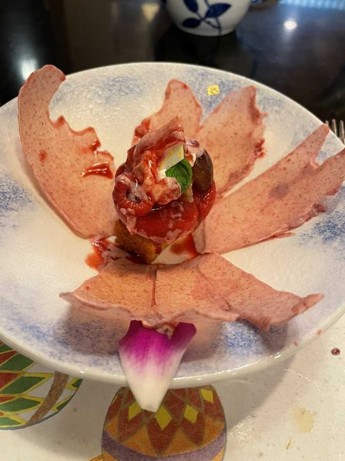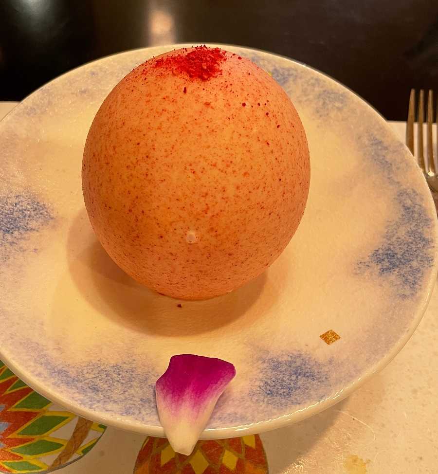 あったかいラズベリーソースをかけるとパカッとドームが開きます~!おもしろいですね。こちらのデザートは今まで宿泊した施設の中でも絶品だったと思います。