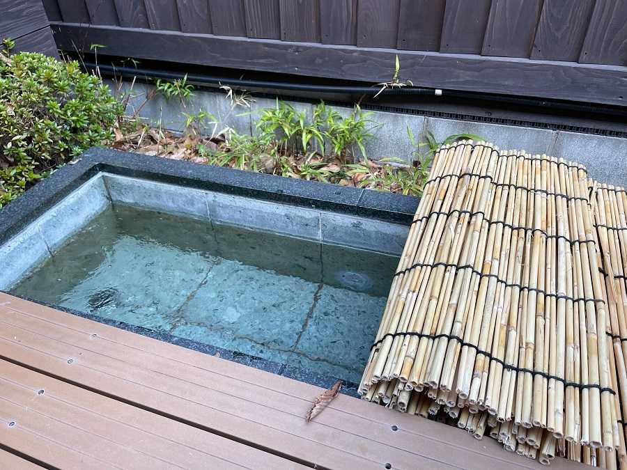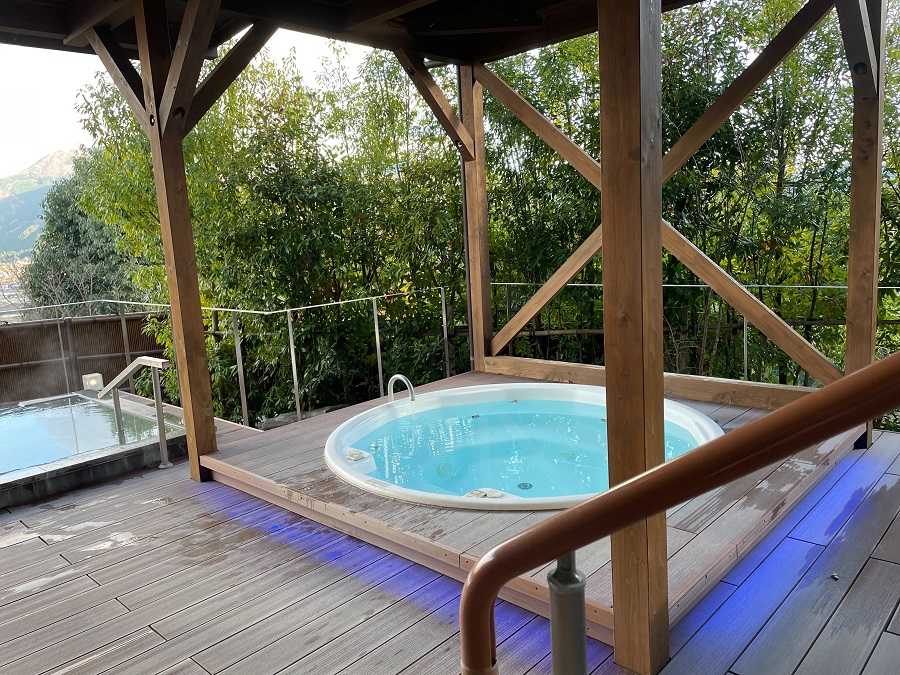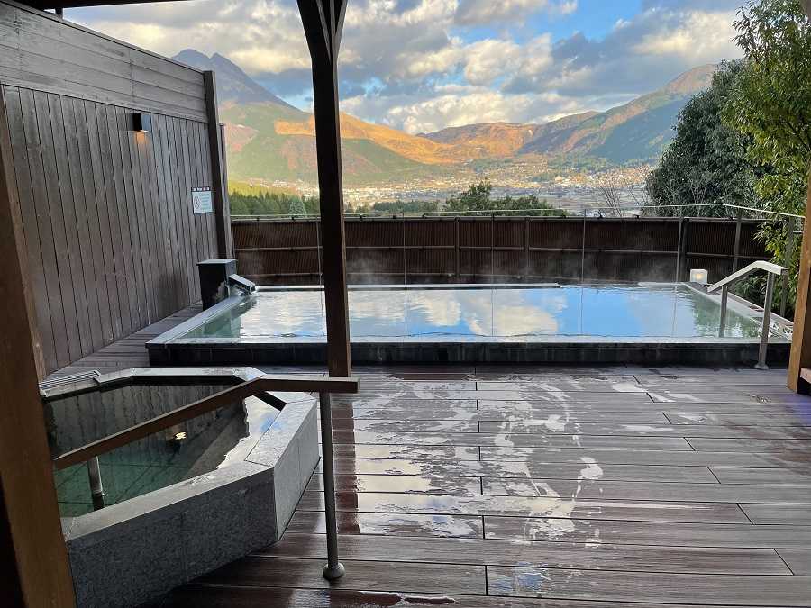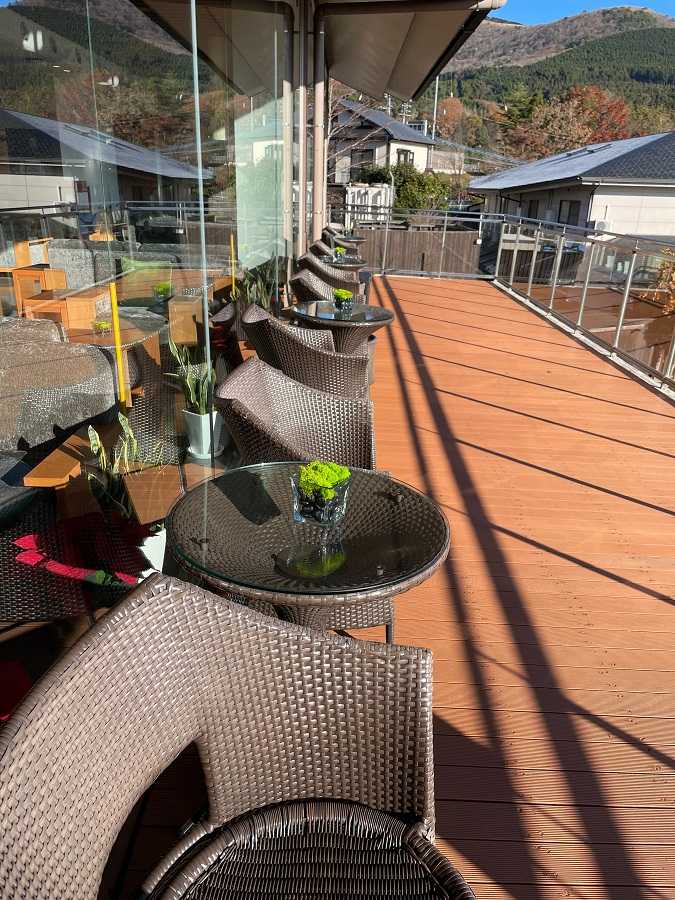テラスというかウッドデッキには足湯もあって、ウッドデッキからも露天風呂のほうに入っていくことができます。でもここからは由布岳は見えなかったですね。
