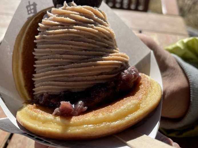 チェックアウト後に湯布院の散策をしましたよ。こちら、モンブランどら焼き850円なり。湯の坪通りの 鞠智( ククチ )さんというお店にて。