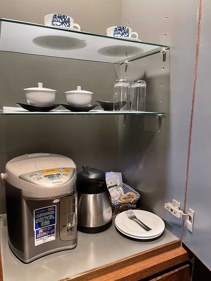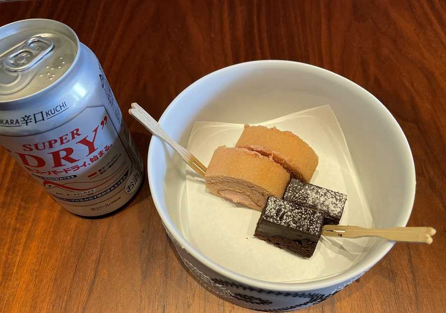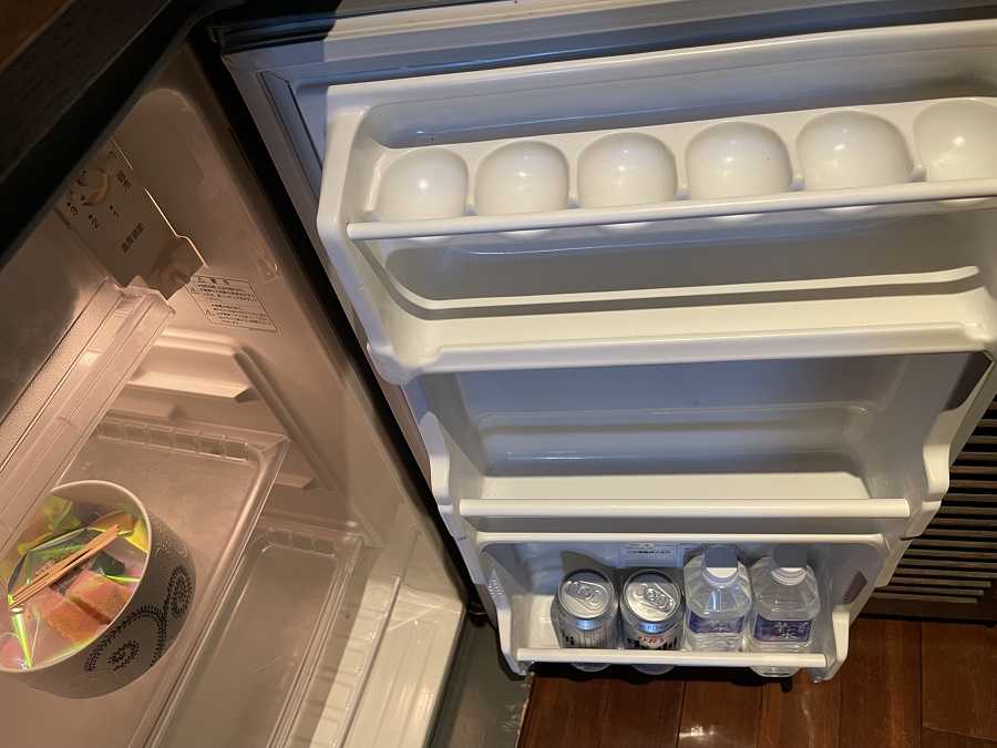冷蔵庫の中にはフリーのドリンクとウェルカムスイーツが。