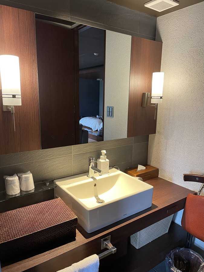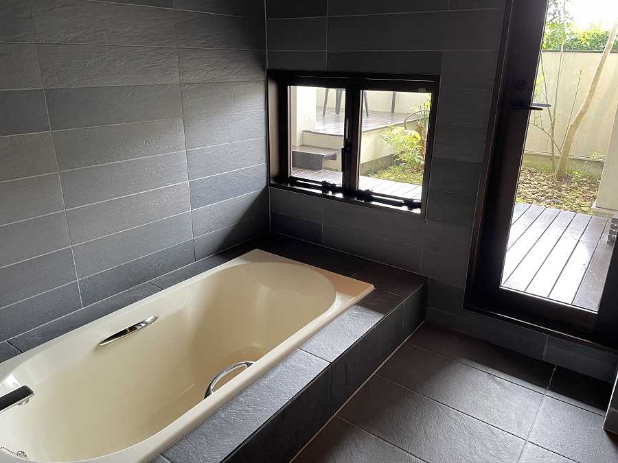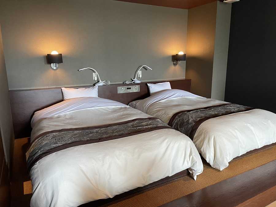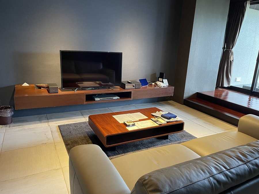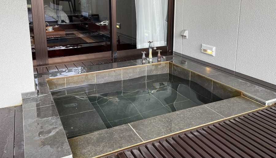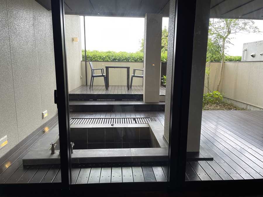 玄関からお部屋に入りますと・・写真右手に半露天風呂、左側に寝室があります。露天風呂には温泉がはいっておらず、チェックイン後に自分たちで入れるようになっています。私はこの方式がわりと好きです。部屋風呂といえども毎日お湯が変えられているのかどうかわからないですし。。