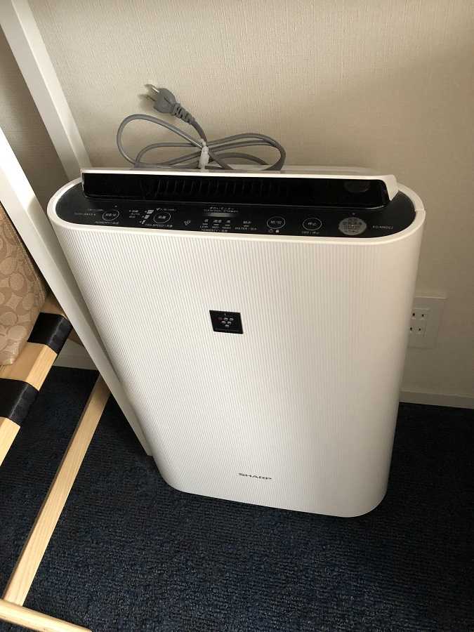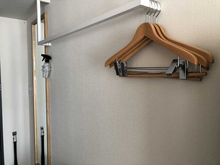 壁に取り付けられたハンガーかけ。狭い部屋ならではの工夫?これ、いいかも。