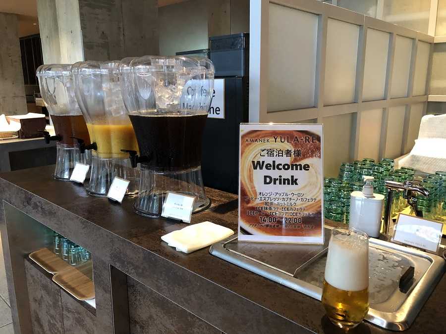 今回はYURA-RE Loungeでお酒が飲み放題になる、フリーフロープランというプランで予約しましたが、ソフトドリンクはウェルカムドリンクということで、宿泊者なら14:00~22:00までは飲むことができます。