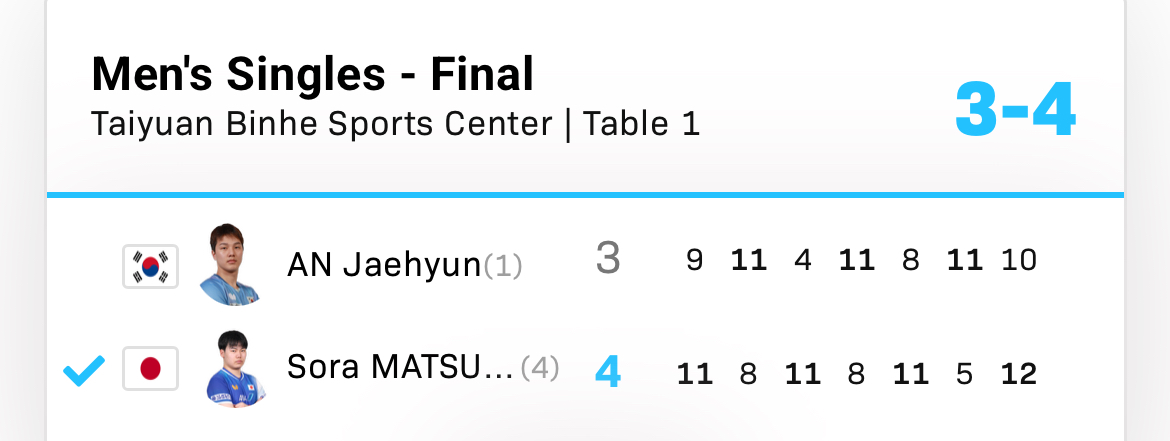 | 21:00 | T1 | 男子S-決勝 | 松島輝空WR32 4-3 アン・ジェヒョン(韓国)WR22 初優勝おめでとう!競り勝った!メンタルや右足が心配だったけど、勝ち切りましたね ![]() ![]() ![]() |