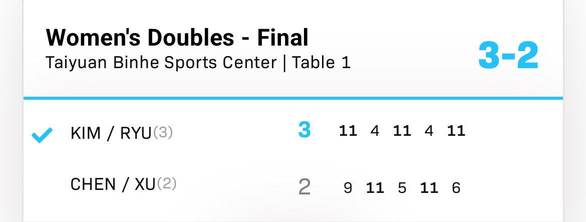| 19:40 | T1 | 女子D-決勝 | キム・ナヨン/リュウ・ハンナ(韓国)3-2 徐奕/陳熠(中国)![]() |