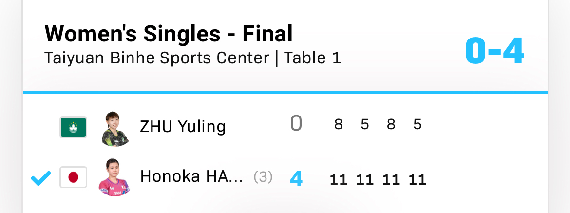 | 20:20 | T1 | 女子S-決勝 | 橋本帆乃香WR18 4-0 朱雨玲(マカオ)WR37 全員ストレート勝ちは凄い!日本人キラーのつゆリンを破ってくれてありがとう! ![]() ![]() |