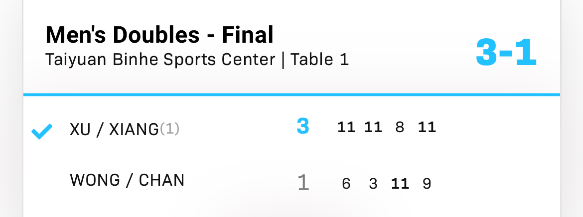 | 19:00 | T1 | 男子D-決勝 | 徐瑛彬/向鵬(中国) 3-1 黄鎮廷/陳顥樺(香港)![]() |