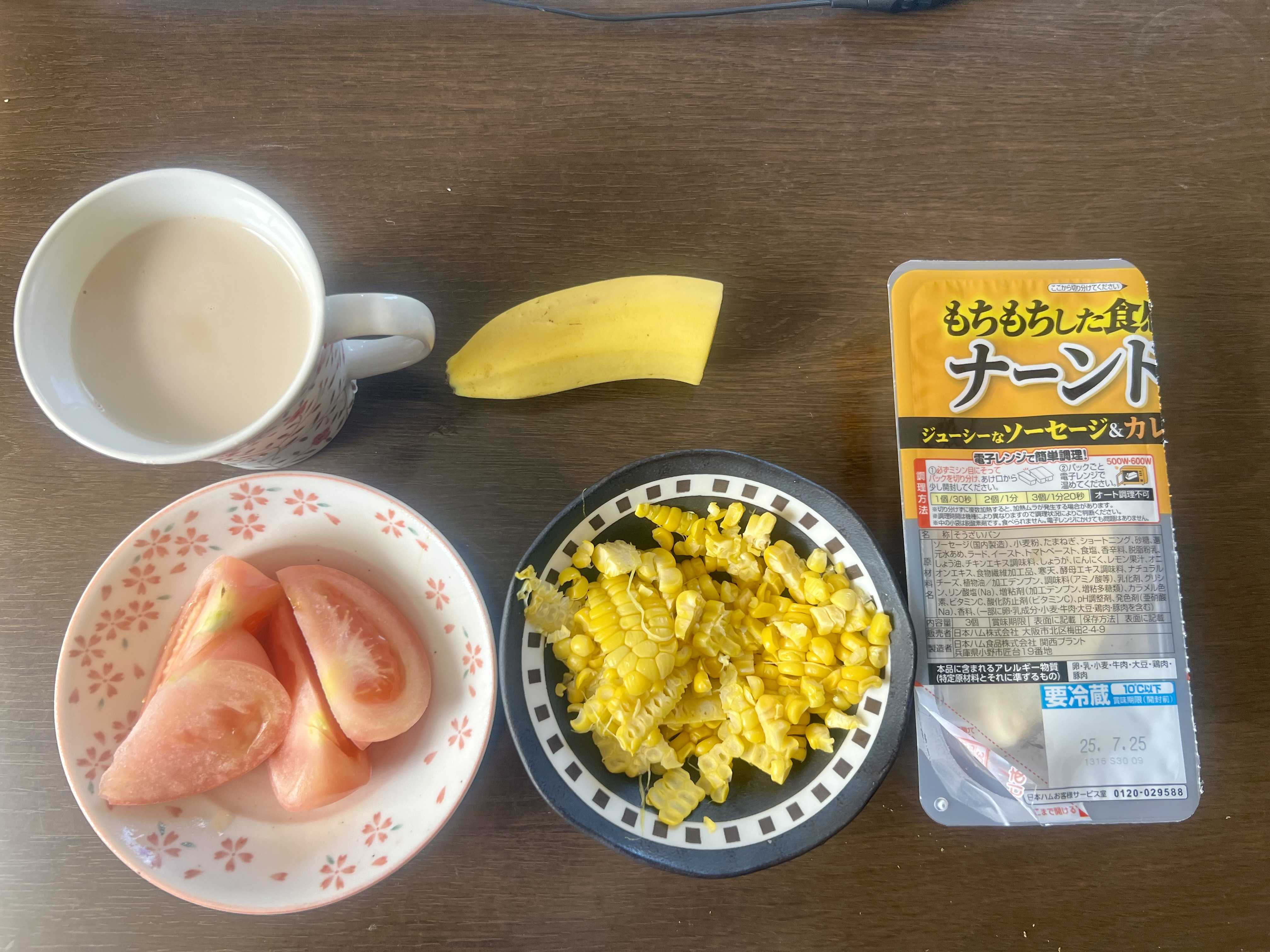 朝食は、もちもちした食感のナーンドッグ、蒸しとうもろこし、バナナ、トマト、カフェオレ。