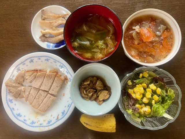 朝食は、豚ロースステーキ・エリンギ焼き、鶏・玉ねぎ・人参・蒟蒻煮、茄子のポン酢漬け、サニーレタス・コーンサラダ、白菜の味噌汁。