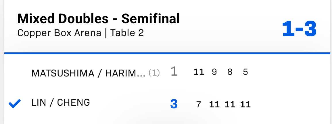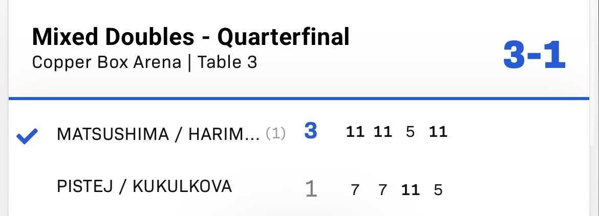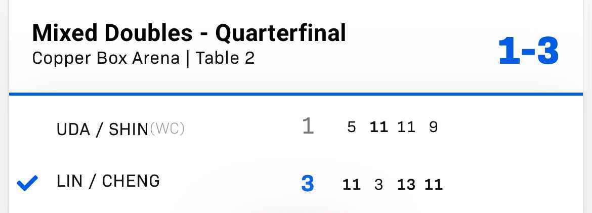 | 19:00 | T2 | 混合D-準々決勝 | 宇田幸矢/シン・ユビン(日本/韓国)1-3 林昀儒/鄭怡静(台湾)![]() |