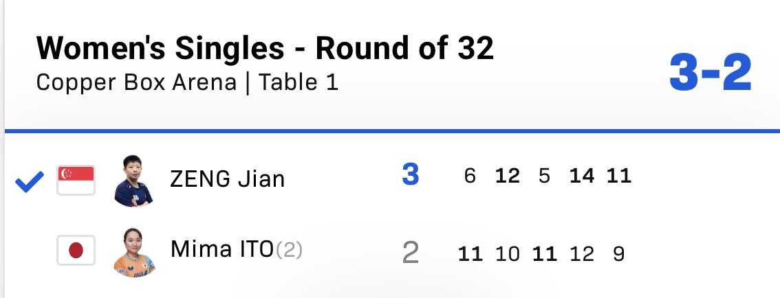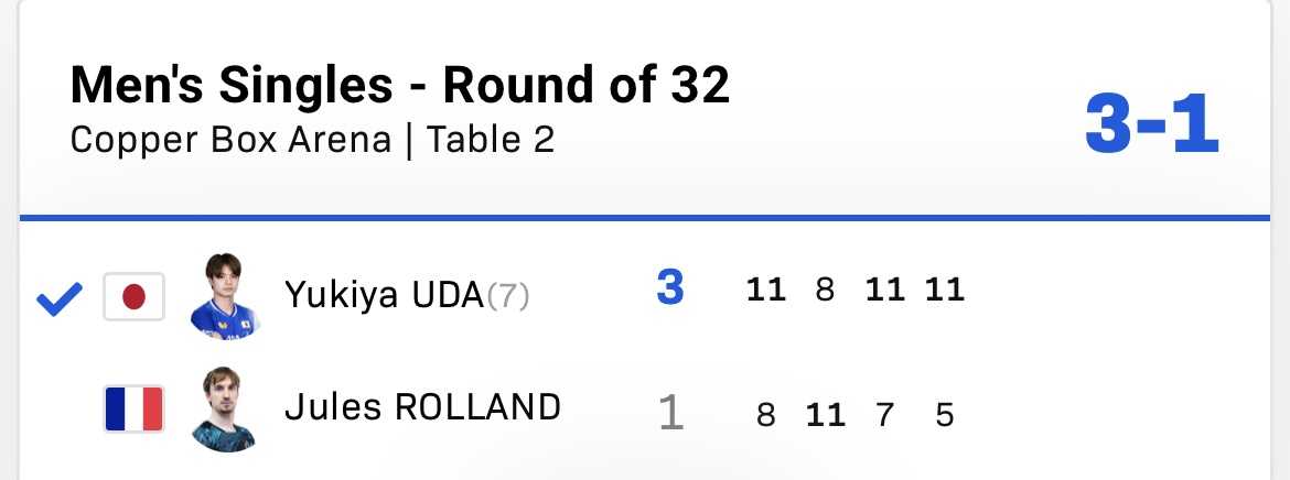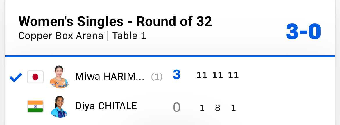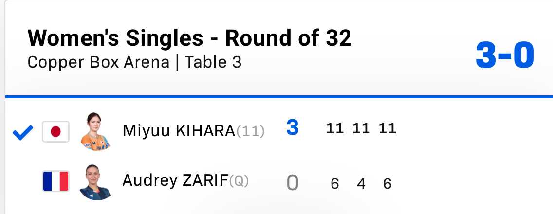| 22:30 | T1 | 女子S-2回戦 | 張本美和WR7 3-0 チターレ(インド)WR82![]() ![]() |