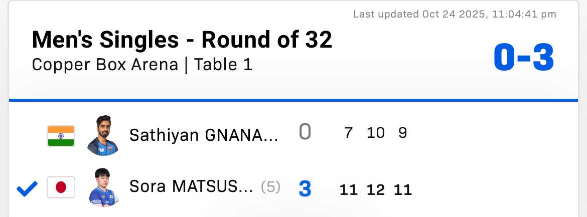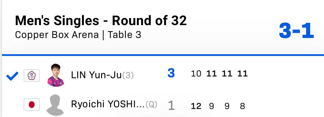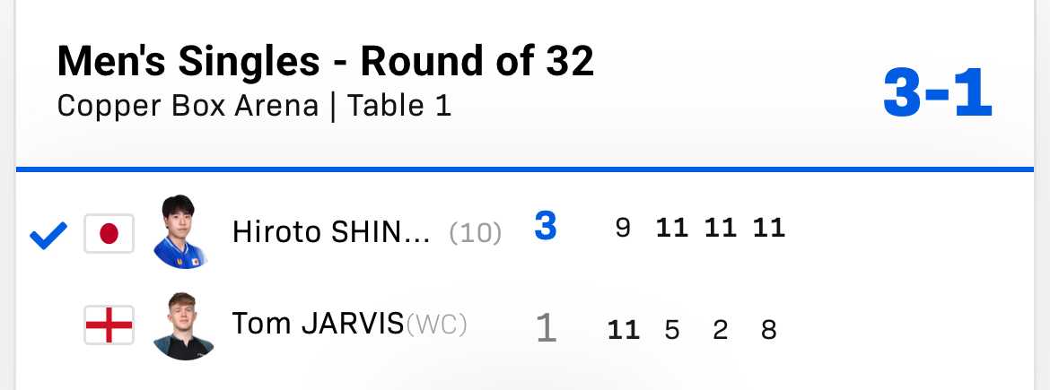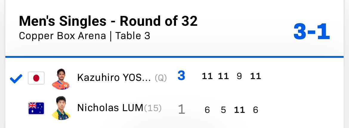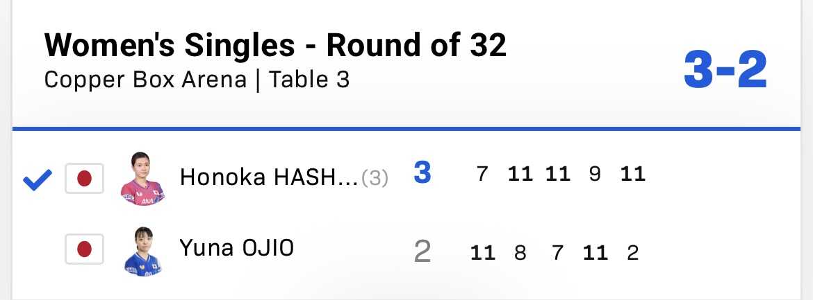 | 21:55 | T1 | 男子S-2回戦 | 松島輝空WR16 3-0 サシヤン・グナナセカラン(インド)WR56![]() |