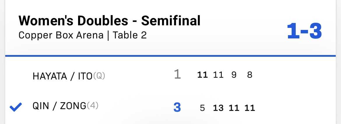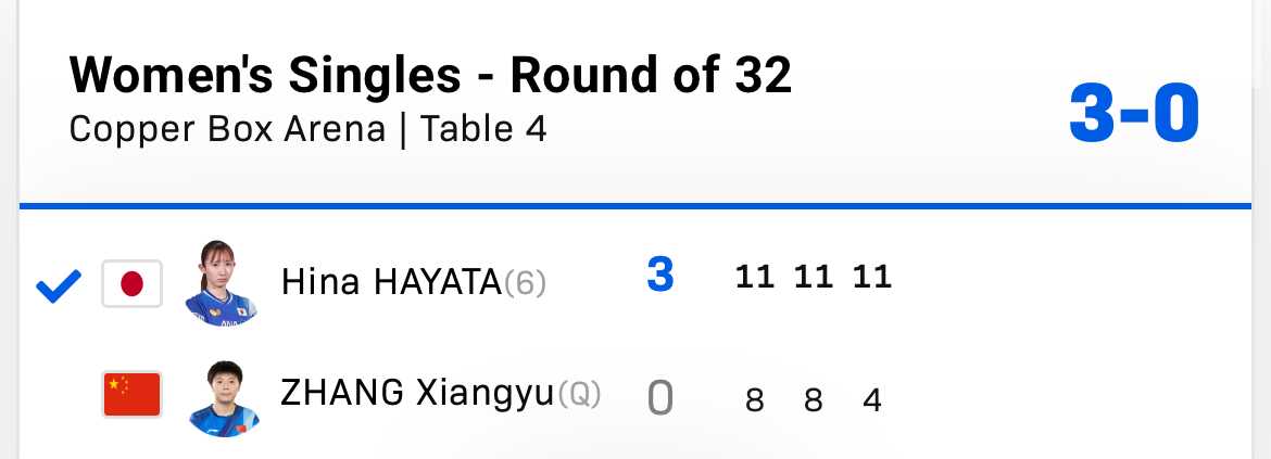 | 19:35 | T4 | 女子S-2回戦 | 早田ひなWR14 3-0 ZHANG Xiangyu(中国)WR162![]() |
