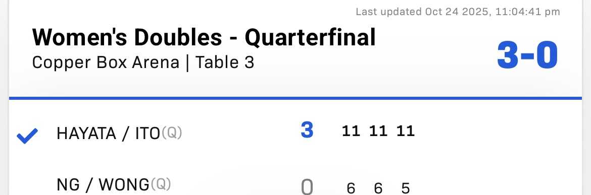 | 21:55 | T3 | 女子D-準々決勝 | 伊藤美誠/早田ひな 3-0 呉詠琳/WONG Hoi Tung(香港)![]() |