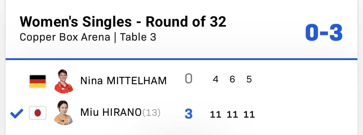 | 25(土)2:10 | T3 | 女子S-2回戦 | 平野美宇WR35 3-0 ニーナ・ミッテルハム(ドイツ)WR93![]() |